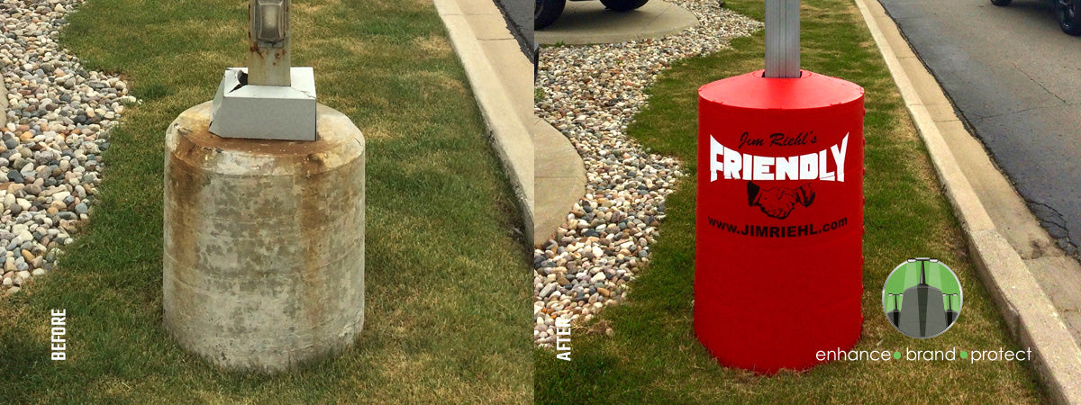 An innovative, durable, branded rings used to cover unsightly, deteriorating cement light pole bases.