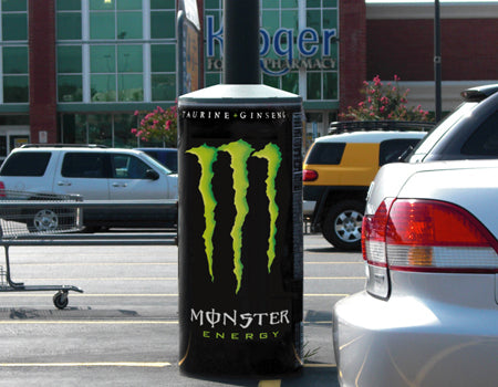 AdPoles allow you to create a custom Poletector Wrap that can display a design that encircles the entire Poletector, instead of a simple front and back placement. It also lets you create a design that can extend past the height of the cement base itself giving the advertisement a more 3 Dimensional effect. See a few examples below and contact us for a custom quote!